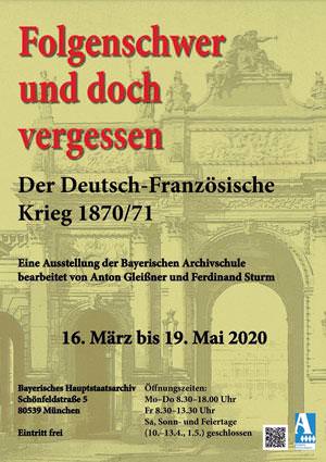 Ohne Zählung: Folgenschwer und doch vergessen. Der Deutsch-Französische Krieg 1870/71. Eine Ausstellung der Bayerischen Archivschule, bearbeitet von Anton Gleißner und Ferdinand Sturm. Bayerisches Hauptstaatsarchiv, 16.3.-19.5.2020, 27 S., farbige Abb., keine ISBN.