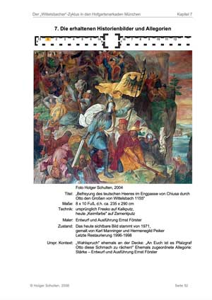 Im Oktober 1829 wurden zwei Abschnitte der Hofgartenarkaden mit sechzehn Wandbildern zur bayerischen Geschichte für das Publikum geöffnet – gemalt von Schülern von Peter Cornelius. Im ersten Teil dieser Studie steht der ehemalige Gesamtdekor im Zentrum. Zum Arbeitsablauf von 1826 bis 1829 erlauben neu ausgewertete Quellen interessante Ergänzungen zum bisherigen Wissensstand. Erstmals wird die ursprüngliche Deckenbemalung genauer vorgestellt. Ein Schriftwechsel zwischen Cornelius und König Ludwig I. gibt Einblick in die Genese der Bild-Titel. Zeitgenössische Beschreibungen und Kritiken erlauben außerdem zumindest eine gewisse Vorstellung der heute verlorenen Allegorien. Die unterschiedliche Qualität der heute sichtbaren Wandbilder drängt zudem die Frage nach dem Erhaltungszustand auf. Im zweiten Teil werden daher erstmals ausführlich die Zerstörungen und „Restaurierungen“ bis zum letzten großen Eingriff 1971/72 behandelt. Im dritten Teil zeigt dann das exemplarisch herausgegriffene Bild zur bayerischen Verfassung bewusste Abweichungen vom tatsächlichen Geschehen. Dabei wird die Notwendigkeit deutlich, bei einer etwaigen gleichmäßigen Behandlung aller Historienbilder das Gemalte jeweils kritisch sowohl mit den historischen Fakten als auch mit dem damaligen Geschichtswissen zu vergleichen. Abschließend bietet der vierte Teil Fotografien der erhaltenen Historienbilder und Allegorien mit Informationen zu Technik und Maßen, zum Zustand und ursprünglichem Kontext, zu den dargestellten Inhalten, zur Genese des Bildtitels und zum Maler.